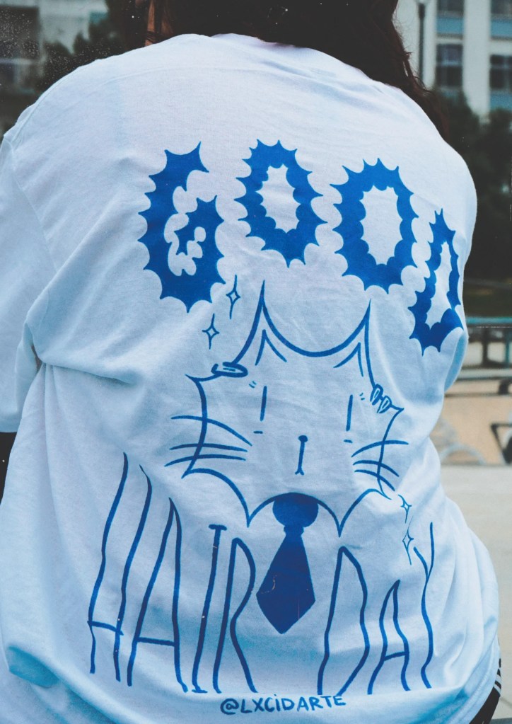 Apresento-te um dos meus bestsellers da coleção: “GOOD HAIR DAY”. Esse tipo de mistura (gato descabelado, mas frase a dizer “dia do cabelo bom”) provoca reação. Não é só bonito, como também é relatable e memorável.